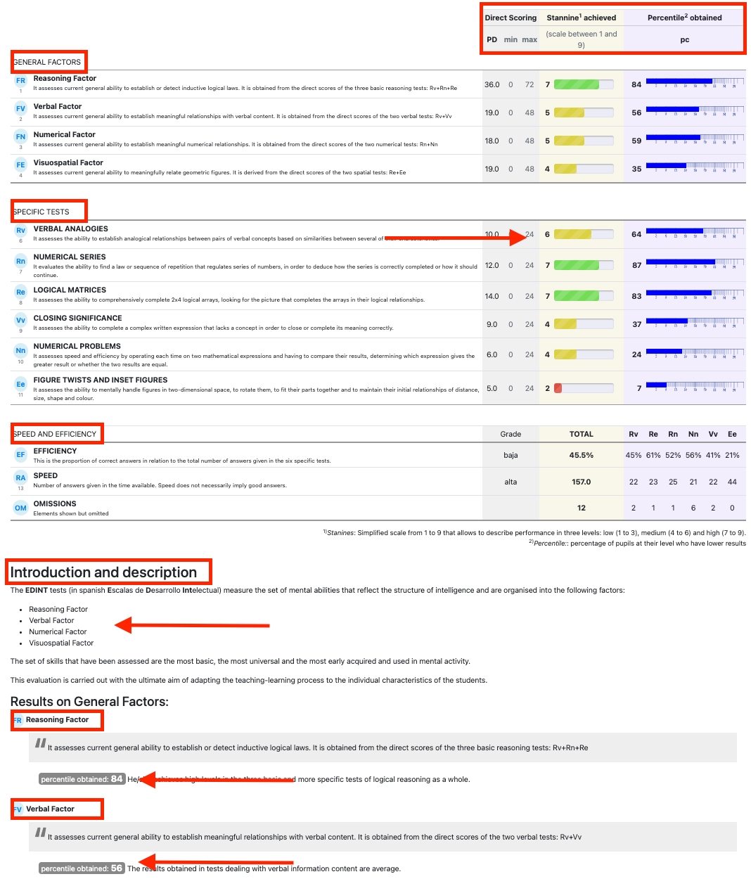 Presentation of quantitative results to be sent to patients or their parents. It serves as a summary of the scores obtained by the patient. In addition, it incorporates a brief explanation of the cognitive skills assessed. Unlike the individual report, it does not show the general intelligence and IQ data, so as not to create confusion or misrepresent information about the patient's cognitive factors.