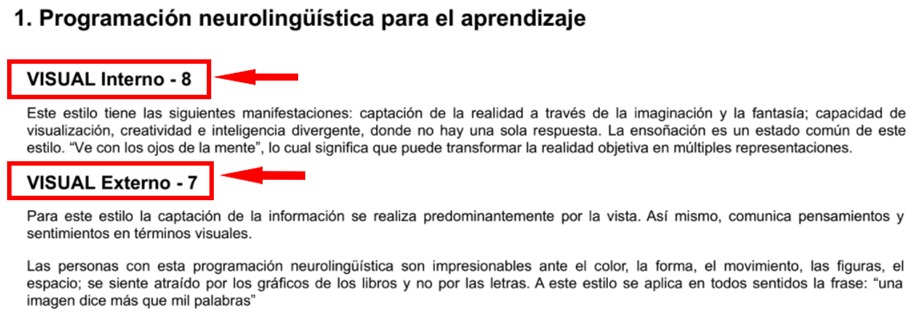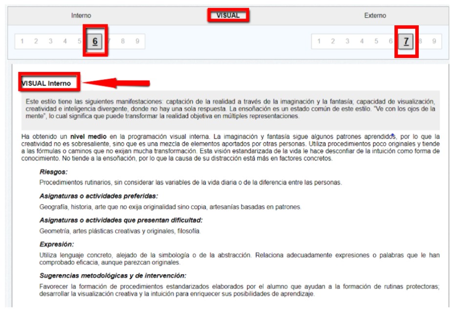 El informe detalla los factores cognitivos y emotivos en cuanto a la forma en que se procesa la información. Es decir, se diagnostica el canal de preferencia para percibir, procesar y exponer la información para que de esta manera se pueda orientar a los evaluados en la identificación de las técnicas, materiales y actividades que le sirvan como instrumentos para alcanzar el éxito académico, aprovechando sus fortalezas y fortaleciendo sus debilidades. Además cuenta con sugerencias metodológicas de intervención para potencias cada un de los factores evaluados.