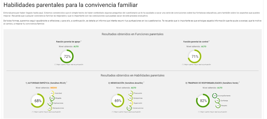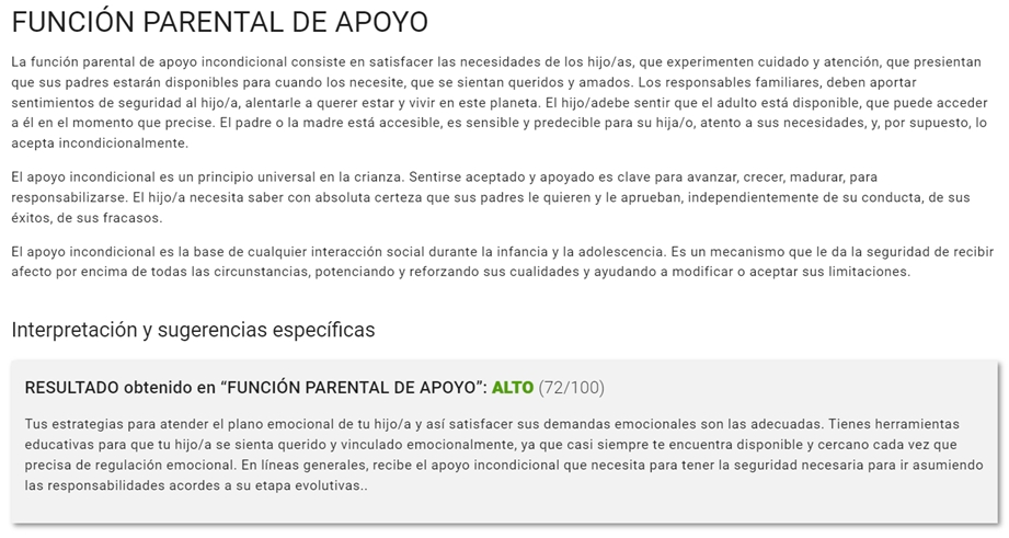 En este informe se resumen las puntuaciones obtenidas. Se presentan los resultados en Funciones Parentales y en Habilidades Parentales. Así mismo, se muestra interpretación y sugerencias específicas para poder trabajar en la mejora de los indicadores evaluados.