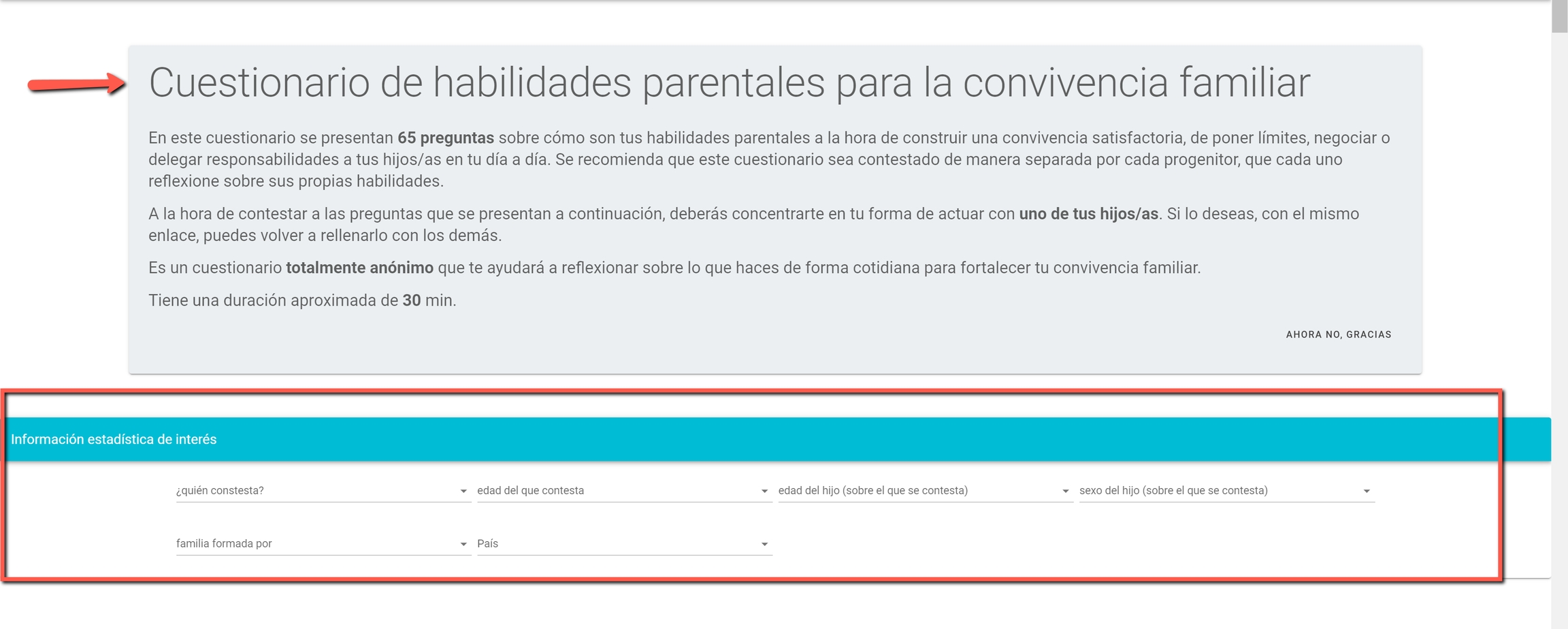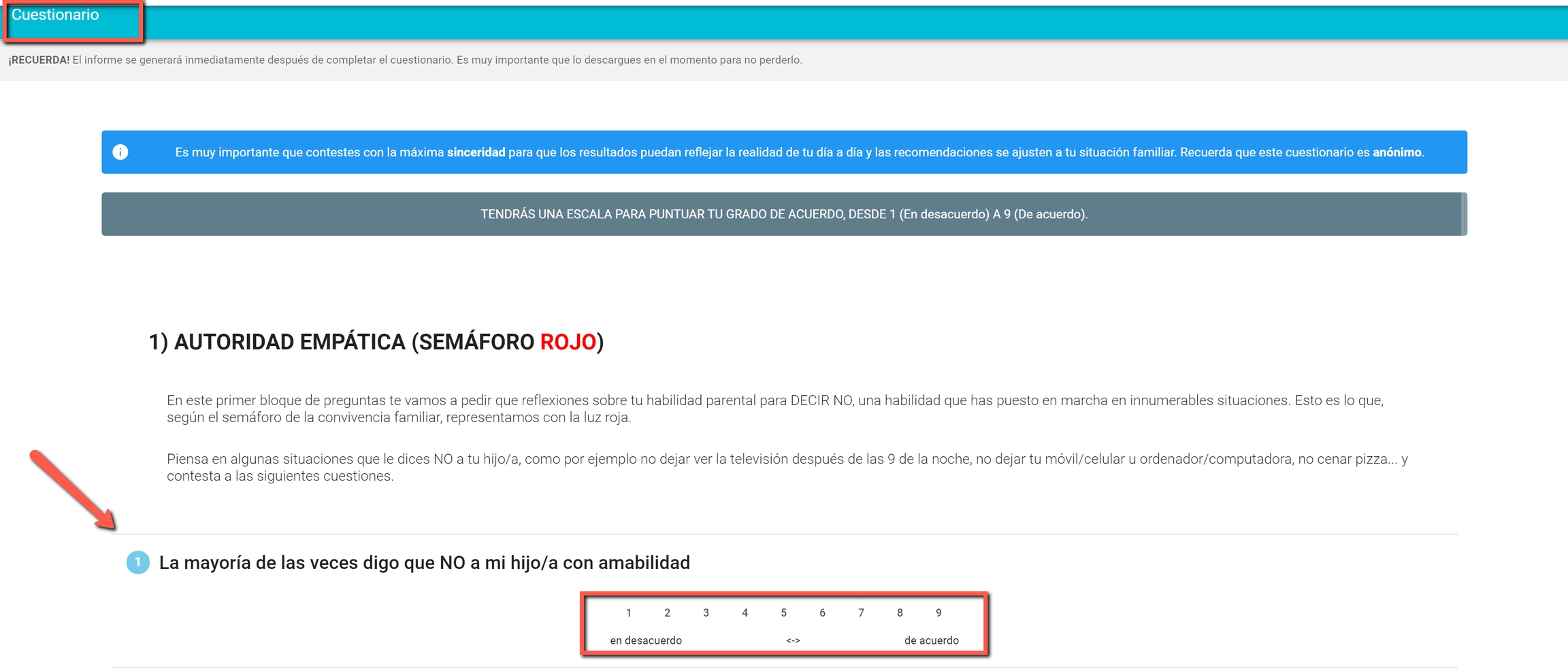 El cuestionario se deberá completar pensando en uno de los hijos/as, por ejemplo con el que más dificultades se tenga en la convivencia familiar, o bien, se podrá realizar el cuestionario para cada uno de los hijos/as, teniendo en cuenta que se tendrá que generar una clave temporal distinta por cada prueba a contestar.