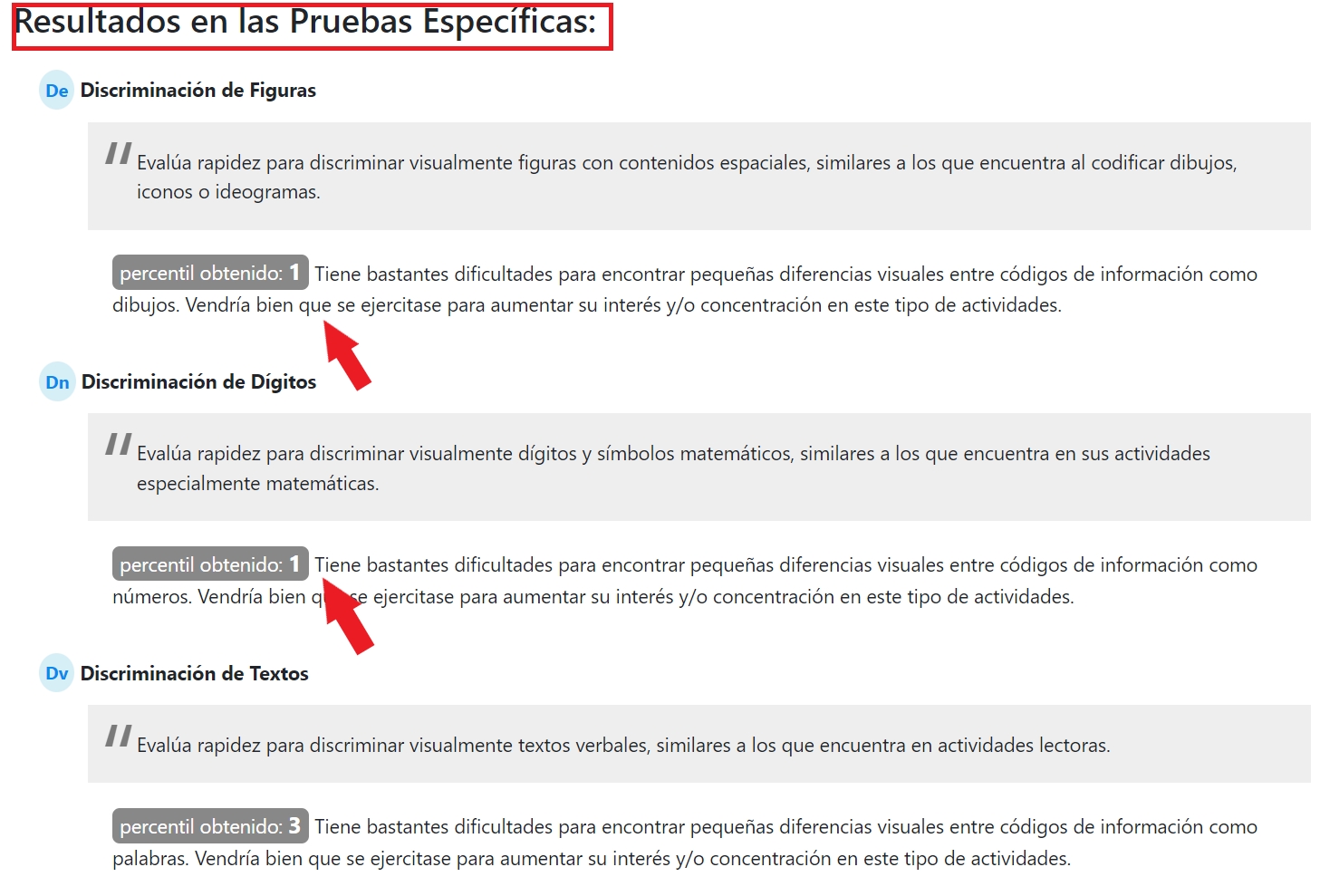 Presentación de resultados cuantitativos para poder enviar a los padres del estudiante. Funciona como resumen de las puntuaciones obtenidas. Con esta información los padres de familia podrán ayudar a prevenir problemas de aprendizaje derivados de potenciales dificultades atencionales.