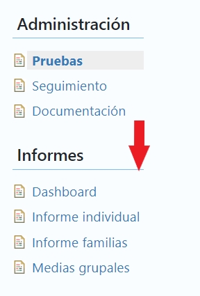En la barra lateral izquierda podrás visualizar los diferentes tipos de informes para esta prueba: