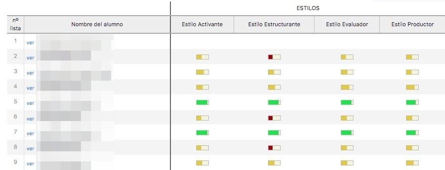El dashboard permite ver los resultados del grupo de docentes o directivos que han realizado la prueba. En un solo tablero se pueden analizar los resultados del grupo, observando los estilos evaluados (Estilo Activante, Estilo Estructurante, Estilo Evaluador y Estilo Productor). Este panel sigue la línea cromática habitual de nuestra plataforma para identificar el grado de prevalencia de cada uno de los estilos, situándose en color rojo los resultados con una prevalencia baja, en amarillo media y en verde alta.