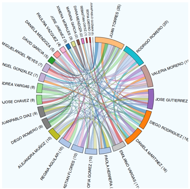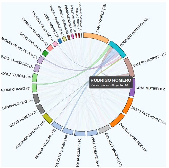 En el sociograma propuesto se observa en el círculo con colores diferentes el nombre de cada uno de los alumnos de clase. Al pasar el ratón por encima de cada uno, se eliminan todas las relaciones y sólo aparecen las del alumno marcado, donde nos dará información de sobre las influencias de la clase, el líder o los alumnos rechazados.
