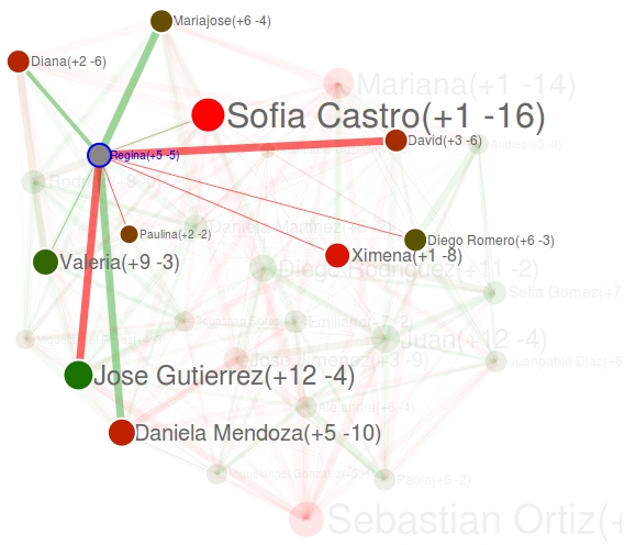 Como decimos, al pasar el ratón/mouse por encima de cada color (que corresponde a un alumno), se verá claramente la elección o rechazo que realiza, y de manera grupal, permite al docente observar los siguientes fenómenos o tipologías sociales: