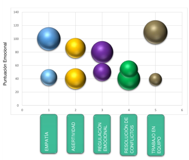 Cada puntuación del eje de las X corresponde a una escala (Empatía, Asertividad, Regulación emocional, resolución de problemas, trabajo en equipo).