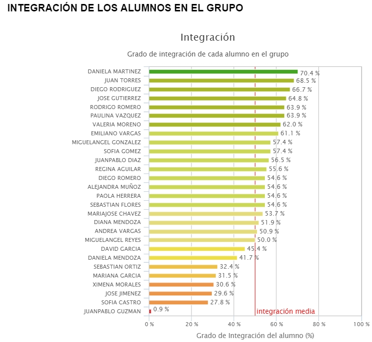 Según Gil Pascual, se puede definir la integración como una relación particular del sujeto y el grupo. Para conocer el nivel de integración grupal de nuestros alumnos se ofrece el siguiente gráfico de la puntuación de integración que ha obtenido cada alumno.