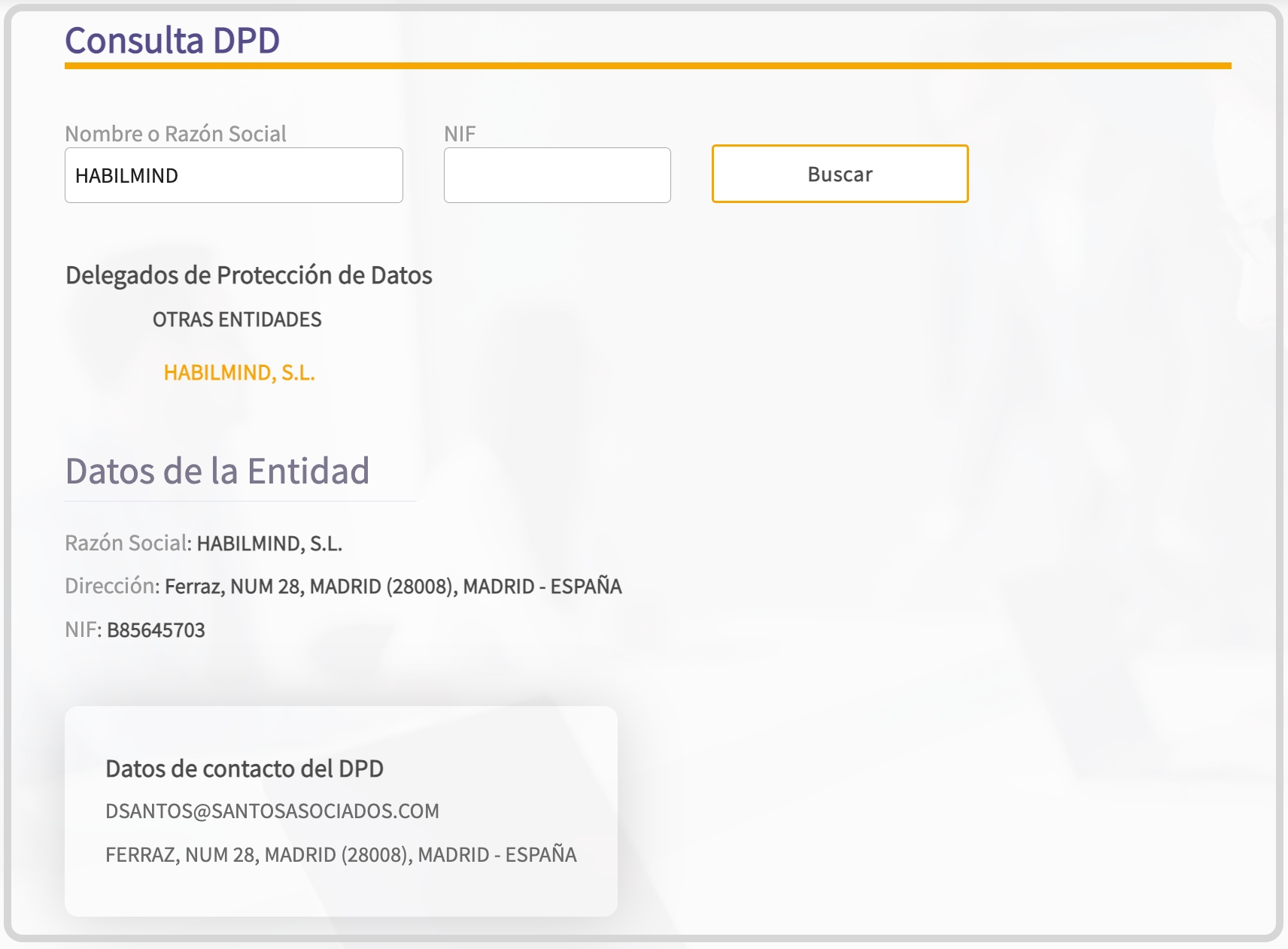 Existe una herramienta oficial para comprobar la designación oficial del DPD y en consencuencia, poder comprobar que Habilmind cumple con la normativa vigente en RGPD. Herramienta oficial Consulta DPD: accesible en https://sedeagpd.gob.es/sede-electronica- web/vistas/infoSede/consultaDPD.jsf
