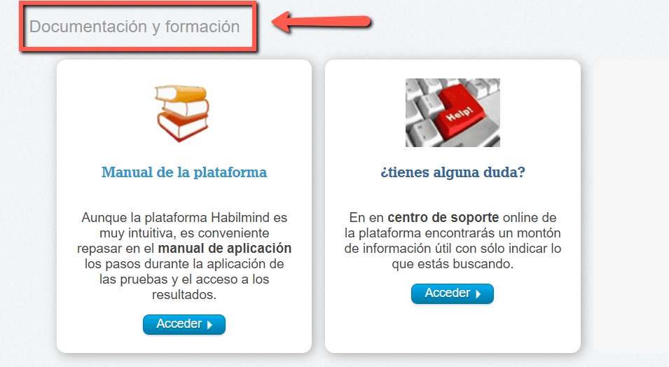 Documentación y formación: Apartado en la parte inferior de la plataforma donde tendrás acceso a la base de conocimiento, la cual contiene toda clase de artículos y documentos relacionados con el uso de la plataforma así como manuales para aplicación de las herramientas de evaluación. Te recomendamos ingresar específicamente a la "cajita" titulada "¿tienes alguna duda?" para documentarte sobre lo que te interese o necesites. Allí mismo podrás chatear con uno de nuestros asesores si tienes alguna duda.