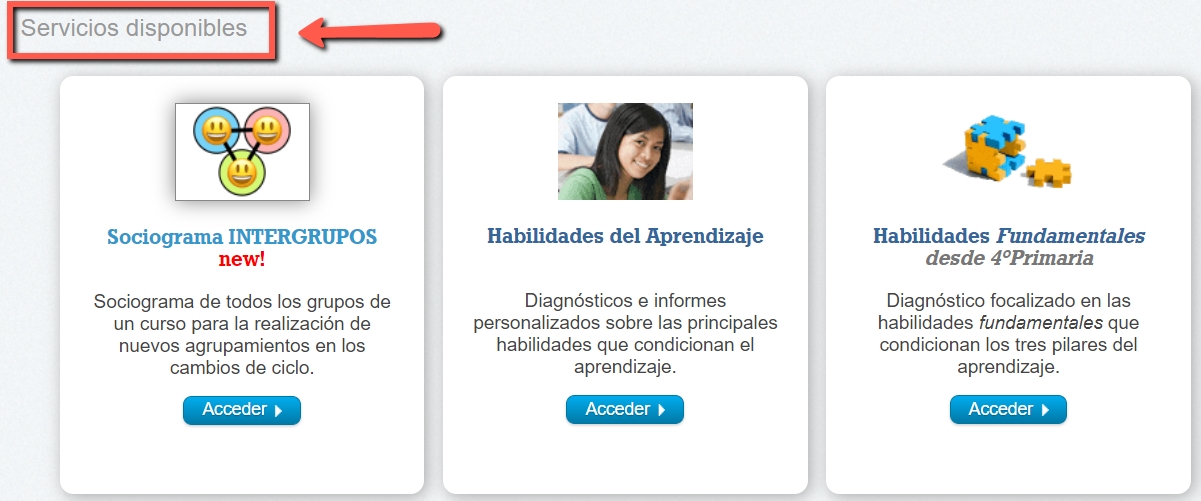 Servicios disponibles: Apartado en donde visualizaras todas las pruebas que están dadas de alta en tu plataforma en forma de "cajitas". Puedes hacer clic en la que desees acceder para revisar todo tipo de resultados e informes.