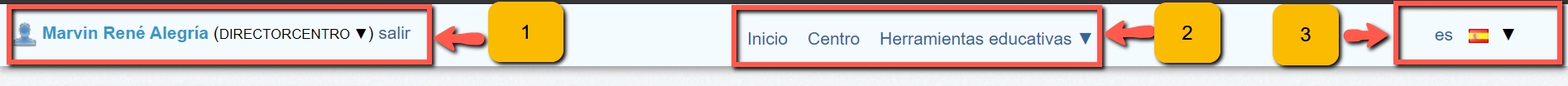 2. En la parte central de la barra superior, estarán las pestañas de "Inicio", "Centro" y "Herramientas Educativas", las cuales te servirán para navegar en plataforma. Las mismas se describen en el próximo apartado.