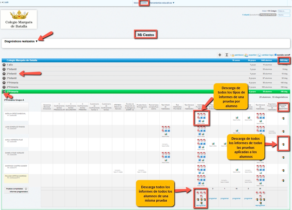 En ella encontrarás a todos los estudiantes que han sido dados de alta en plataforma previamente. Los estudiantes se encuentran agrupados por grados y grupos. Puedes hacer clic en cualquiera de estos, para desplegar el listado con los nombres. Además, puedes visualizar qué pruebas se han aplicado a cada estudiante y ver el número total de pruebas aplicadas a cada grupo. Por último, podrás descargar informes de manera masiva - ya sea individuales o por grupo- si así lo deseas.