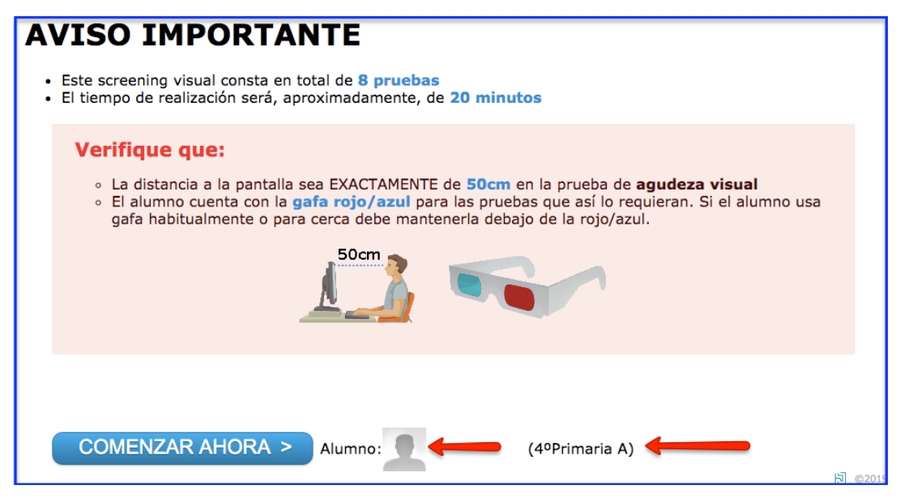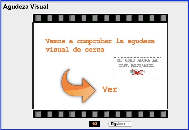 Prueba 1. Agudeza visual: Es una prueba de ejecución sencilla. El alumno tendrá que hacer clic sobre las letras que se le va pidiendo en cada recuadro. El tamaño de la letra solicitada va disminuyendo progresivamente para medir la agudeza visual. Prueba 2. Movimientos de seguimiento: El alumno deberá seguir la pelota verde con los ojos sin mover la cabeza. Cuando la pelota cambie a color rojo pulsará sobre la barra espaciadora. Se debe reiniciar la prueba tanto si por algún motivo el alumno no se ha preparado y la prueba empieza, o en el caso de que se detecte que el alumno mueve la cabeza durante la ejecución de la misma. Conviene comprobar previamente que la barra del espacio funcione correctamente. Prueba 3. Movimientos sacádicos: Se deben seguir las instrucciones de la actividad anterior, movimientos de seguimiento. Prueba 4. Visión de los colores: El alumno deberá marcar la respuesta correcta según lo que perciba en la imagen. Prueba 5. Binocularidad: En esta prueba el alumno deberá utilizar las gafas/lentes rojo-azul. Si ya usa gafas/lentes habitualmente, deberá ponerlas/os ya sea encima o debajo de sus gafas/lentes habituales. Después responderá las preguntas que se les presenten. Prueba 6. Visión en profundidad: Con las gafas/lentes rojo-azul deberá señalar aquel número que parece elevarse por encima de los demás. Con los alumnos más pequeños es muy importante asegurarse de que comprenden bien el concepto "encima". Prueba 7. Divergencia: Para asegurarse de que ha comprendido la tarea, se debe realizar un breve entrenamiento previo. Para ello se sugiere el siguiente ejercicio: haciendo modelado, pedir al alumno que sitúe un lápiz en posición vertical en el cruce de los ojos y la nariz a unos 30 centímetros de distancia. A continuación, indicar que se concentre en lo que ve a ambos lados del lápiz, de manera que empezará a ver el lápiz borroso. Una vez haya comprendido el efecto visual que debe realizar, le pediremos que se ponga las gafas/lentes rojo-azul e inicie la prueba. Para su realización, deberá forzar su mirada para mantener las figuras superpuestas a pesar de que se moverán lentamente. En el momento en que ya no pueda mantener una figura dentro de la otra y empiece a verlas separadamente, deberá pulsar la tecla de espacio de su teclado.