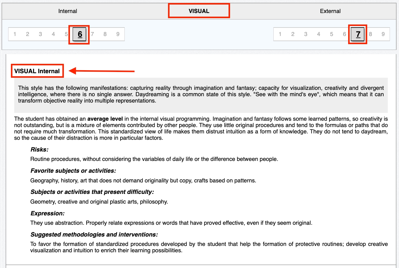 The report details cognitive and emotionalfactors in terms of how information is processed. In other words, it diagnoses the preferred channel for perceiving, processing and exposing information so that patients can be guided in identifying techniques, materials and activities that serve as instruments to achieve academic success, taking advantage of their strengths and strengthening their weaknesses. It also has methodological suggestions for intervention to enhance each of the factors evaluated.